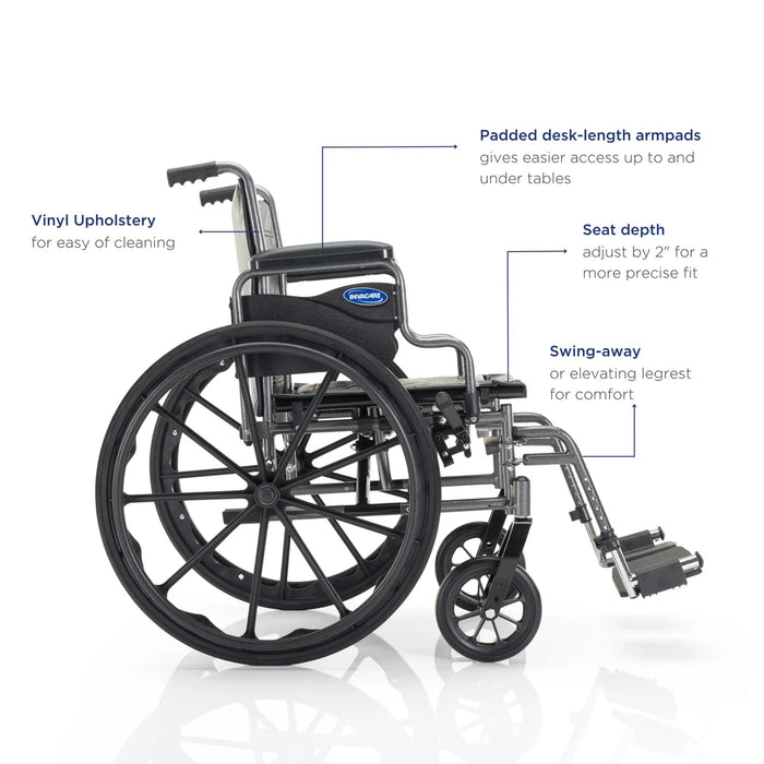 The Invacare Essentials SX3 wheelchair for adults is designed with the utmost comfort, durability, and versatility in mind, providing a top-of-the-line mobility solution. Featuring a sturdy yet lightweight foldable frame, this wheelchair offers effortless portability without compromising strength. Its thoughtful design ensures long-term comfort, while customizable adjustments such as a two-inch adjustable seat depth provide a personalized fit for each user.